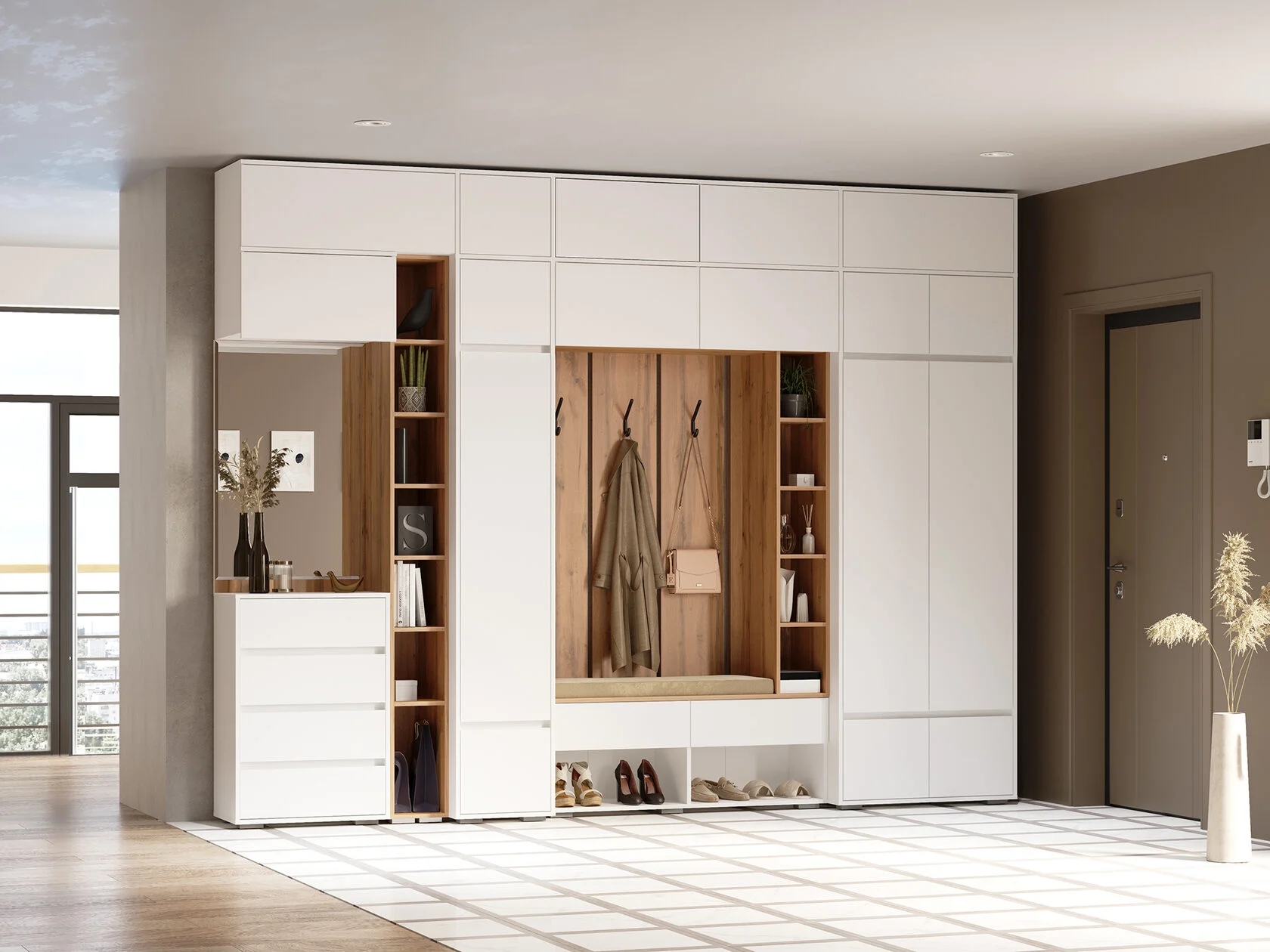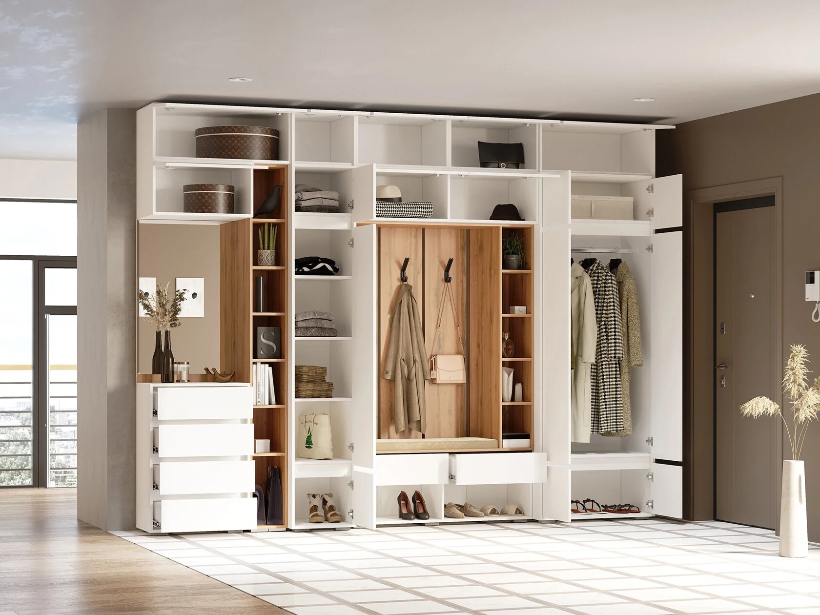 Прихожая – это обязательная составляющая любой квартиры или дома. Именно данное помещение создает первое впечатление о жильцах. Модульная прихожая «Прага» характеризуется в первую очередь функциональностью. Она достаточно вместительна для хранения различных вещей, обуви, одежды, сумок. Данное изделие выполнено в современном цветовом стиле, который отличается мобильностью, удобством и отличным функционалом. Вы можете собрать модульную прихожую под любое Ваше желание, если добавить антресоли общая высота прихожей составит 2,5 метра.Материал корпуса: ЛДСП